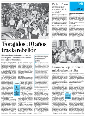 ‘Forajidos’: 10 años tras la rebelión Unos están en el Gobierno, otros se han alejado. Gutiérrez insiste en que hubo golpe. Un análisis. Los 10 años de la caída del ex- allá de las debilidades, los mopresidente Lucio Gutiérrez se vimientos que nacieron hace cumplieron ayer. Y algunos de 10 años se mantuvieran autólos denominados ‘forajidos’ se nomos. “Cuando una organimantienen en el escenario po- zación civil no es autónoma, lítico, muchos en el oficialismo. tiende a ser absorbida por el Los ‘forajidos’ protagonizaron Estado y por el Gobierno y el derrocamiento de Gutiérrez empieza a desaparecer como durante una revuelta que inició fuerza crítica y contestataria”, el 19 de abril de 2005, en rechazo agrega Sierra. a su gestión administrativa. En el grupo se destacaban, Desde adentro por ejemplo, algunas figuras Diego Guzmán cree que lo más que hoy son parte de este Go- importante del 20 de abril fue bierno, incluido el presidente, la acumulación de una insatisRafael Correa; Diego facción de la población Guzmán, excercano co“que se sintió traicionaCIFRAS da por quien eligieron laborador del Régimen; el exasambleísta y exmiy salió a las calles para nistro de Cultura Paco buscar la revocatoria del Velasco; el presidente mandato”. Y asegura que AÑOS del directorio del IESS, estuvo Gutiérrez no se trató de un golpe de en el poder. Richard Espinoza... Estado, como repite hasEn cambio otros, ta ahora el expresidente como Alberto Acosta, MINISTERIOS Gutiérrez. Manuela Gallegos o NorGuzmán también le entregó a ini- dice que siente orgullo man Wray, dejaron de Pachakutik cialmente. ser parte del Gobierno de haber participado en por discrepancias con la el Gobierno “porque (el política de PAIS. presidente Correa) me ayudó La politóloga Natalia Sierra a sacar adelante al Fondo de analiza que en el momento de Inversión Social Emergente las protestas contra Gutiérrez, (FISE) y cumplir con más de los movimientos tenían una mil obras”. línea contestataria y crítica al También aclara que quienes Régimen, “pero el espíritu y abandonaron el proceso lo hilas demandas de esa época se cieron porque, según su punto hizo poder en este Gobierno… de vista, quizá no se cumplía lo Las bases fuertes de PAIS fue- que para ellos debía hacerse. ron los ‘forajidos’”, afirma. “Respeto mucho eso, aunque Para esta especialista, lo no coincido”, sostiene y consiideal hubiese sido que, más dera que hubiese sido impor-
