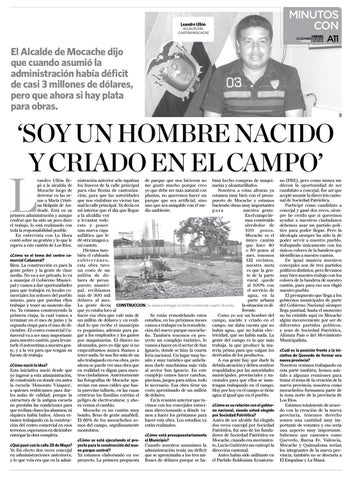 nistración anterior sólo tapaban de parque que nos hicieron no bían hecho compras de maquilos huecos de la calle principal me gustó mucho porque creo narias y alcantarillados. Nosotros a estas alturas ya para elas fiestas de cantoniza- yo que debe ser más natural con ción, para que las autoridades plantas, no queremos hacer un estamos muy bien con el presuque nos visitaban no vieran tan parque que sea artificial, sino puesto de Mocache y estamos mal la calle principal. Yo decía en uno que sea amigable con el me- haciendo obras muy importantes para nuestra gente. mi interior que el día que llegue dio ambiente. En el campo hea la alcaldía voy mos construido a levantar todo alrededor de esto y poner 100 pozos. una nueva capa Mocache es el asfáltica que le único cantón dé otra imagen a que hace 40 mi cantón. o 50 pozos al Hicimos tammes, tenemos bién el cableado 132 recintos, subterráneo, nuestra meta esta obra tuvo es que la genun costo de un te de la parte millón de dórural quede lares de presual 100% con puesto municiel servicio de pal, recibíamos agua, en la más de 300 mil parte urbana dólares al mes. la situación es diLa gente decía ConSTRUCCIon. se espera entregar el centro comercial a partir de junio. ferente. que yo estaba loco al Como yo soy un hombre del hacer esa obra que vale más de Se están remodelando estos un millón de dólares y en reali- estudios, en los próximos meses campo, nacido y criado en el dad lo que recibe el municipio vamos a trabajar en la remodela- campo, me daba cuenta que no es poquísimo, además para pa- ción del nuevo parque mocache- había agua, que no había elecgar a los empleados y los gastos ño. También tenemos en pro- tricidad, que no había nada. La por maquinarias. El dinero no yecto un complejo turístico, lo gente del campo es la que más alcanzaba, pero yo dije que si no vamos a hacer en el sector de San trabaja, la que produce la maempezábamos nunca íbamos a Ignacio, donde se hizo la cuarta teria prima para que salgan los tener nada. Se nos fue más de un feria nacional. Un lugar muy bo- derivados de los productos. A esa gente hay que darle la año trabajando en esa obra, pero nito y muy turístico que anhelaahora se puede ver una obra que mos darle muchísima más vida debida atención y deben sentirse en realidad es digna para nues- al sector San Ignacio. En este respaldados por las autoridades tros ciudadanos. Anteriormente complejo vamos hacer canchas, municipales, provinciales y nalas fotografías de Mocache apa- piscinas, juegos para niños, todo cionales para que ellos se manrecían con unos cables que has- lo necesario. Esa obra tiene un tengan trabajando en el campo. ta parecían tallarín, en las casas costo aproximado de un millón Hoy por hoy en el campo se tiene agua al igual que en el pueblo. céntricas las familias corrían el de dólares. peligro de electrocutarse, y ahoEn la reunión anterior que tura vemos el cambio. vimos con los concejales estuvi- ¿Cómo es su relación con el gobierMocache es un cantón muy mos direccionando a dónde va- no nacional, siendo usted elegido bonito, lleno de gente amableß. mos a hacer los préstamos para por Sociedad Patriótica? El 86% de los mocacheños so- hacer esta obra. Los estudios ya Antes de ser alcalde fui elegido mos del campo, orgullosamente están realizados. dos veces concejal por Sociedad montubios. Patriótica, fui uno de los funda¿Cómo está presupuestariamente dores de Sociedad Patriótica en Mocache, cuando era movimien¿Cómo se está ejecutando el pro- el Municipio? yecto para la construcción del nue- Cuando nosotros asumimos la to, Lucio Gutiérrez me entregó la administración tenía un déficit dirección cantonal. vo parque central? Antes había sido militante en Ya estamos elaborando en ese que se aproximaba a los tres miproyecto. La primera propuesta llones de dólares porque se ha- el Partido Roldosista Ecuatoria-