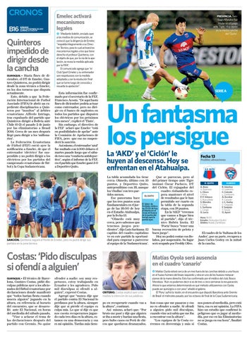 Que se parezcan, pero al La tabla acumulada los tiene cerca: Olmedo, último con 33 del primer tiempo ante Tigre puntos, y Deportivo Quito, insinuó Óscar Pacheco, DT antepenúltimo con 35, aunque del Ciclón. El exjugador del cuadro riobambeño eslos ‘chullas’ con tres parpera mantener el nivel tidos menos. EL DATO de resultados que le han Ese panorama hace permitido ser cuarto en que los tres puntos sean ‘ídolo’ de fundamentales en el jue- El Ambato visita a la tabla de la segunda go de las 18:00 de hoy las 15:00 de hoy etapa, con 19 puntos. Manta en el En la ‘AKD’ “creemos en el Estadio Atahualpa, al Jocay en busca de la punta del que vamos a llegar bien por la fecha 13. torneo que la al partido”, dijo el téc“Olmedo está muy perdió ayer. nico Rubén Insúa. El cerca, pero sabemos que ‘Poeta’ busca “tener una tenemos juegos pendientes”, dijo Luis Saritama. El buena recreación de pelota y capitán del cuadro capitalino buen juego”. Hoy no podrá contar con Bove en este partido la oportunidad para empezar a parecerse laños, por suspensión. Su lugar al equipo de la ‘Sudamericana’. será ocupado por Freddy Olivo.