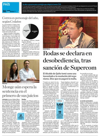“Cuando me enteré de esto, “ilegal, ilegítima y absurda”, por la verdad pensé que era una lo que anticipó que no se someinocentada”. Con esas pa- terá a la multa y que se acogerá labras el alcalde de Quito, al derecho constitucional a la Mauricio Rodas, reaccionó resistencia. ayer ante la multa que le fue “Nadie en este país, en su impuesta por la Superinten- sano juicio, podría creer que yo dencia de Información y Co- he cometido un acto de censura municación (Supercom). previa, cuando toda mi vida me El funcionario fue san- he caracterizado por ser un clacionado con 10 salarios bá- ro defensor de las libertades y de sicos unificados (equivalente manera muy particular de la lia 3.400 dólares) por bertad de expresión”, dijo. un supuesto caso de cifras Rodas acotó que la san“censura previa” a la ción impuesta proviene de retransmisión de un una resolución con claras programa del portal “motivaciones políticas” DólarEs Ecuadorinmediato en es la sanción y sostuvo que ha existido impuesta a las radios del Municiuna campaña sistemática Rodas. pio. en su contra por parte de Además, el Alcalde sectores interesados en capitalino se convirafectar su gestión. Es El tió así en la primera artículo Santiago Guarderas, de la autoridad de elección Constitución que decano de la Facultad de consagra el popular en recibir una derecho a la Jurisprudencia de la Uniresistencia. sentencia de la Superversidad Católica, señaló com. que la postura asumida La resolución, emitida el por el Alcalde es la correcta, miércoles pasado, indica que pese a que se trata de un fallo de este valor debe ser deposita- última instancia. do a la entidad en un plazo de El profesional refirió que la 72 horas luego de la notifica- figura de la resistencia está conción y que esto es de obligato- sagrada en la Constitución para rio cumplimiento. el caso de violación a los dereRodas contestó ayer, no chos constitucionales de una obstante, que esta sanción es persona, como Rodas alega que