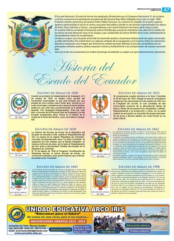 Escudo de Armas de 1830 La historia del Escudo de Armas de la República del Ecuador se remonta a 1830, cuando el "Departamento del Sur" se separa de la original "República de Colombia", conocida conceptualmente como "La Gran Colombia". Al separarse los tres estados que la habían integrado, se mantuvo la ficción de unión, por lo tanto el "Departamento del Sur" pasó a denominarse "Estado del Ecuador en la República de Colombia". El 19 de agosto de 1830 el Congreso Constituyente de Riobamba decretó el primer Escudo de Armas, sin mencionar la bandera, pues quedó implícito que continuaba siendo la de "Colombia".