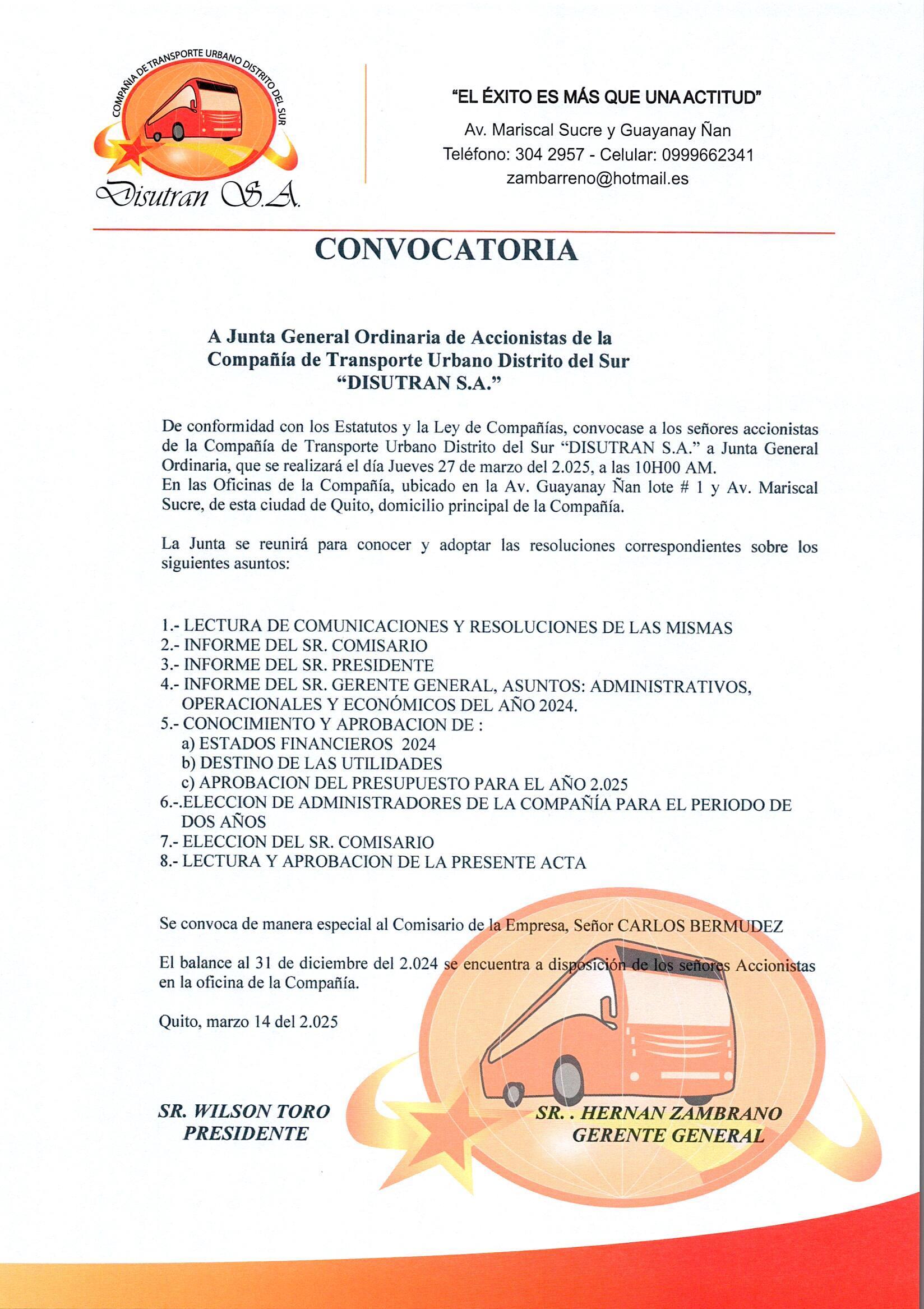 De conformidad con lo dispuesto en la Ley de Compañías, el reglamento y por los Estatutos Sociales de la compañía, se convoca a los señores accionistas a la Junta General Ordinaria que se realizará el día jueves 3 de abril del 2025, a las 17H00, en la dirección Huasipungo No. 70 y Reino de Quito, parroquia San Antonio de Pichincha, del Distrito Metropolitano de Quito, provincia de Pichincha.