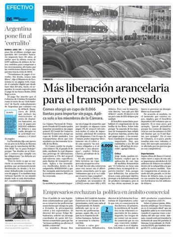 dólares. Pero con la importación directa, “nos sale por 520 dólares”, anotó. El ahorro es de un poco más de 100 dólares por unidad. El beneficio arancelario positar sin el pago de aranceles, que bilitará el congelamiento de las por ejemplo, en algunos casos tarifas de los fletes. Sobre todo pagan 1% de arancel Ad-valo- porque “la mayoría de los insurem (sobre el valor de impor- mos de transportes han subido tación), adicional 83 centavos de precios: baterías, aceites, hay por kilogramos. Con el cupo, la que pagar peajes… y los neumáCámara podrá importar direc- ticos constituyen un gasto muy importante. Hay que tamente sin el cobro y cambiarlos a los 40 mil de esta manera “no nos km. o 45 mil km de recovemos obligados a ir al transportistas mercado y nos ahorra- pesados aproxi- rrido”, agregó Chávez. madamente mos”, explicó Nelson afiliados a Chávez, presidente de la están Crítica la Cámara Nacional de Cámara. Jorge Ayala, analista triTransporte El año pasado tambutario, explicó que la Pesado del Ecuador. bién tuvieron un cupo aplicación de este tipo pero solo ocuparon cerca de medidas demuestran de 3 mil. En este año, estuvieron que “el Gobierno no tiene una unos tres meses sin el diferi- política clara, ni integral de comiento arancelario, por lo que mercio exterior”. Esto, porque “estimamos que sí se va a utili- “por definición, los aranceles zar el nuevo cupo completo”. tienen como principal objetivo De acuerdo a Chávez, en la proteger a la industria nacional actualidad, un neumático de de producto extranjero, pero si 1.200,5 cuesta entre 650 y 670 no hay oferta nacional, lo que