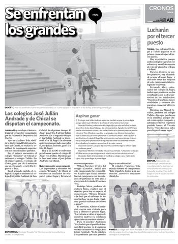 Gabriel. En el primer tiempo, El Ángel ganó 15 a 8 al José Julián Andrade. En el segundo tiempo el José Julián Andrade se impuso 15 a 3 a El Ángel. En el tercer quince en un apretado marcador el José Julián Andrade, ganó 15 a 10 a El Ángel. Hoy a las 10:00 se enfrentan por el tercer puesto, el colegio El Ángel con Tufiño. Mientras que la final será entre el José Julián Andrade con Chical. Quiere ser cuatro veces campeón
