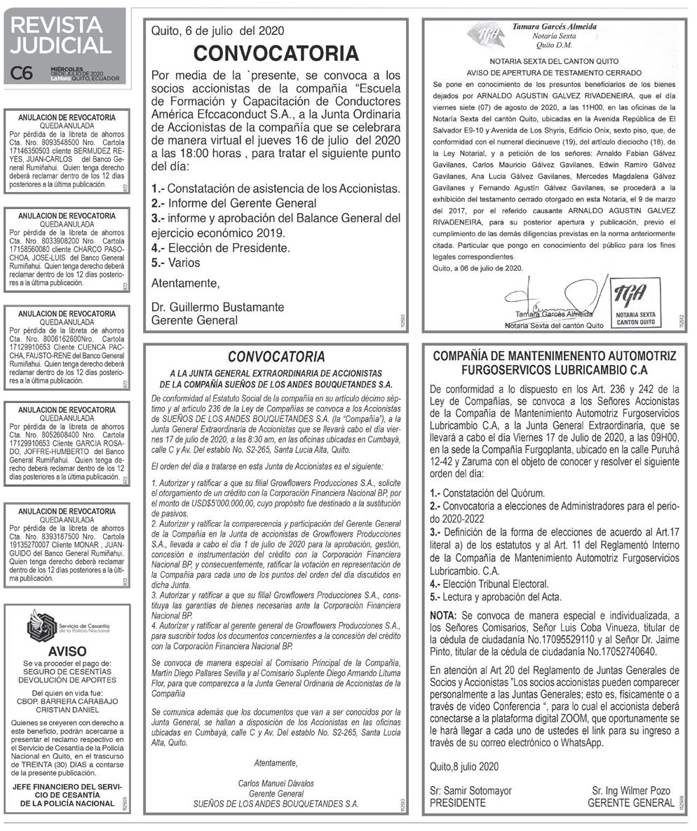De conformidad con el Estatuto de la Corporación, Art. 16, el Directorio convoca a la Asamblea General Extraordinaria virtual de socios, que se celebrará de forma telemática, a través de la Plataforma ZOOM, que se transmitirá desde la oficina ubicada en la Av. Rodrigo de Chávez OE4-19 y Jacinto Collahuazo (Campamento del CEE, Casino de Voluntarios 2do. piso).