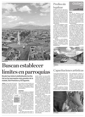 han tenido inconvenientes con IBARRA • Como parte de los ejes principales que tiene la Direc- algún sector vecino, mediante ción de Participación Ciudada- consensos, han podido llegar a na del Municipio de Ibarra, en acuerdos que beneficien a todos su política social, se elaboró una los moradores. ordenanza que se planteo con el objetivo de formar los consejos Actividades ciudadanos, que tienen un sus- Desde esta semana se trabajará tento jurídico, para que sean con las parroquias: San Francisconstituidos por los co y El Sagrario. Al culmimiembros del barrio y EL DATO nar con las delimitaciones tener una dirigencia lese socializará con los poblagitima que conozca bien Participación dores, sobre los resultados Ciudadana tiene su área en la que vive. obtenidos. “Ver con los diridos millones mil dólares, gentes barriales de una maSe ha trabajado en la 600 para invertir en delimitación territorial este proceso. nera objetiva y practica, lo y se empezó con el Prioque tendrá como estructura rato, donde en se conprincipal al barrio, para cocluyó con la parroquia y sus 11 nocer los sectores poblacionales barrios, al igual que Alpachaca y saber quiénes y cuántos soy Caranqui, lo que ha permiti- mos”, explicó Oswaldo Flores, do que la gente conozca a través director de Participación Ciude limites exactos, desde donde dadana. empieza su barrio y hasta donde Se espera que para mayo o termina, pese a que en ocasiones inicios de julio de este año, se