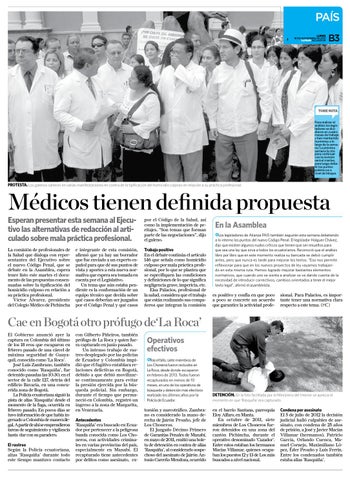 Médicos tienen definida propuesta Esperan presentar esta semana al Ejecutivo las alternativas de redacción al articulado sobre mala práctica profesional. La comisión de profesionales de la Salud que dialoga con representantes del Ejecutivo sobre el nuevo Código Penal, que se debate en la Asamblea, espera tener listo este martes el documento de las propuestas consensuadas sobre la tipificación del homicidio culposo en relación a su práctica profesional. Víctor Álvarez, presidente del Colegio Médico de Pichincha