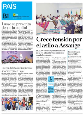 visto, los cancilleres y representantes de los países miembros de la Alianza Bolivariana para Nuestra América (ALBA) realizaron ayer en Guayaquil su IX consejo político para generar un pronunciamiento frente a la supuesta amenaza de Reino Unido de ingresar a la Embajada de Ecuador, en Londres, donde se encuentra con asilo diplomático el fundador de WikiKeaks, Julian Assange. Después de las intervenciones iniciales, el canciller de Venezuela, Nicolás Maduro, reveló que assange habla hoy la resolución que estaba faltanDías Mientras tanto, Assange para la reuprevisto que aprueben nión prevista de y su abogado, el español la OEA. incluía un “apoyo” a la Baltasar Garzón, anunconvocatoria de Ecuaciaron que hablarán hoy dor para la reunión, la toME Nota públicamente desde la “propuesta” de un deEmbajada de Ecuador en bate sobre la vigencia Londres. Policía del asilo ante la Orga- La Garzón se dirigirá al Metropolitana nización de las Nacio- de Londres gasta público en el exterior de dólares nes Unidas, una “ad- 79.000 diarios para evi- la legación ecuatoriana vertencia” al Gobierno tar que Assange a las 05:30 de Ecuador escape. del Reino Unido sobre mientras que el australas “graves consecuenliano lo hará posteriorcias” que según ellos traería mente, a las 08:00. su ingreso a la Embajada de No obstante, WikiLeaks no Ecuador y un “llamado” a los ha desvelado cómo comparegobiernos y actores progresis- cerá Assange, quien podría tas y sociales para respaldar al hablar a los medios de comuGobierno ecuatoriano. nicación desde una ventana o desde el marco de la puerta de la Embajada, pues será detenicriterios La mayoría de discursos se do inmediatamente si sobreencaminaron a rechazar la pasa el perímetro del edificio y postura de Londres frente a extraditado a Suecia. la amenaza de “invasión” en la Embajada. Así comenzó opiniones Bruno Rodríguez, canciller de En su enlace sabatino, el