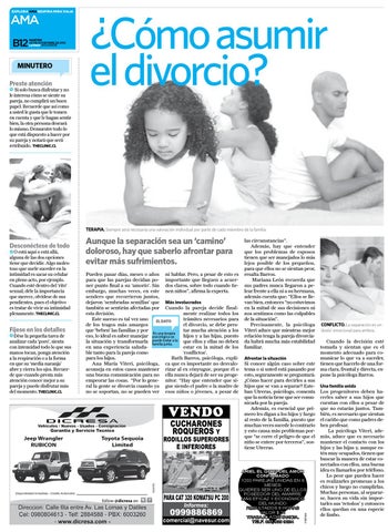 Aunque la separación sea un ‘camino’ doloroso, hay que saberlo afrontar para evitar más sufrimientos. Pueden pasar días, meses o años ni hablar. Pero, a pesar de esto es para que las parejas decidan po- importante que lleguen a acuerner punto final a su ‘amorío’. Sin dos claros, sobre todo cuando tieembargo, muchas veces, en este nen niños”, afirma la experta. sendero que recorrieron juntos, dejaron ‘sembradas semillas’ que Más involucrados también se sentirán afectadas por Cuando la pareja decide finalesta decisión. mente realizar todos los Este suceso es tal vez uno trámites necesarios para EL DATO de los tragos más amargos el divorcio, se debe presque ‘beben’ las familias y por tar mucha atención a los En una terapia eso, lo ideal es saber manejar psicológica se hijos y a las hijas, puesto tratar a la que ellos y ellas no deben la situación y transformarla puede familia junta. en una experiencia saludaestar en la mitad de los ble tanto para la pareja como ‘conflictos’. para los hijos. Ruth Barros, psicóloga, expliAna María Viteri, psicóloga, ca que es importante no desvaloaconseja en estos casos mantener rizar al ex cónyugue, porque él o una buena comunicación para no ella nunca dejará de ser su progeempeorar las cosas. “Por lo gene- nitor. “Hay que entender que siral la gente se divorcia cuando ya gue siendo el padre o la madre de no se soportan, no se pueden ver esos niños o jóvenes, a pesar de