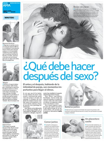 mente, han estudiado el comportamiento luego de hacer el amor. Para dichos especialistas, las féminas buscan sentir una unión de la pareja, en cambio los varones están más interesados en obtener recompensas extrínsecas como fumar o comer. Pero existen algunos consejos para que ambos encuentren lo que quieren luego de ese momento íntimo. ¡No permita que la pasión se desvanezca! YAHoo. LA HorA