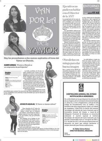 Hoy los presentamos a dos nuevas aspirantes al trono del Yamor en Otavalo. KAREN ARMAS, “El amor a Otavalo es un compromiso de participación” La bella candidata de 18 años de edad, considera que el amor a la ciuDetalles dad que le vio nacer, es una responsaCandidata bilidad para aportar en su desarrollo, desde cualquier parte, en este caso Padres: Rommel Armas y Rosa como candidata a Reina del Yamor. Sánchez. Para Karen el Yamor es la fusión Estudios: Cursa el segundo semestre de de la diversidad del maíz que crece en Terapia Física en la Universidad Central el pueblo Sarance, para obtener la bebidel Ecuador. da sagrada de los antepasados que cada Signo: Acuario año se revive, para que las presentes y Flor: Rosa blanca Color: Azul nuevas generaciones conozcan parte de la historia de Otavalo. Si es elegida Reina, colaborará con las autoridades para sostener los proyectos que tienen planificado, pero si no es así, contribuirá con la soberana en las actividades que ejecute durante el año de trabajo.