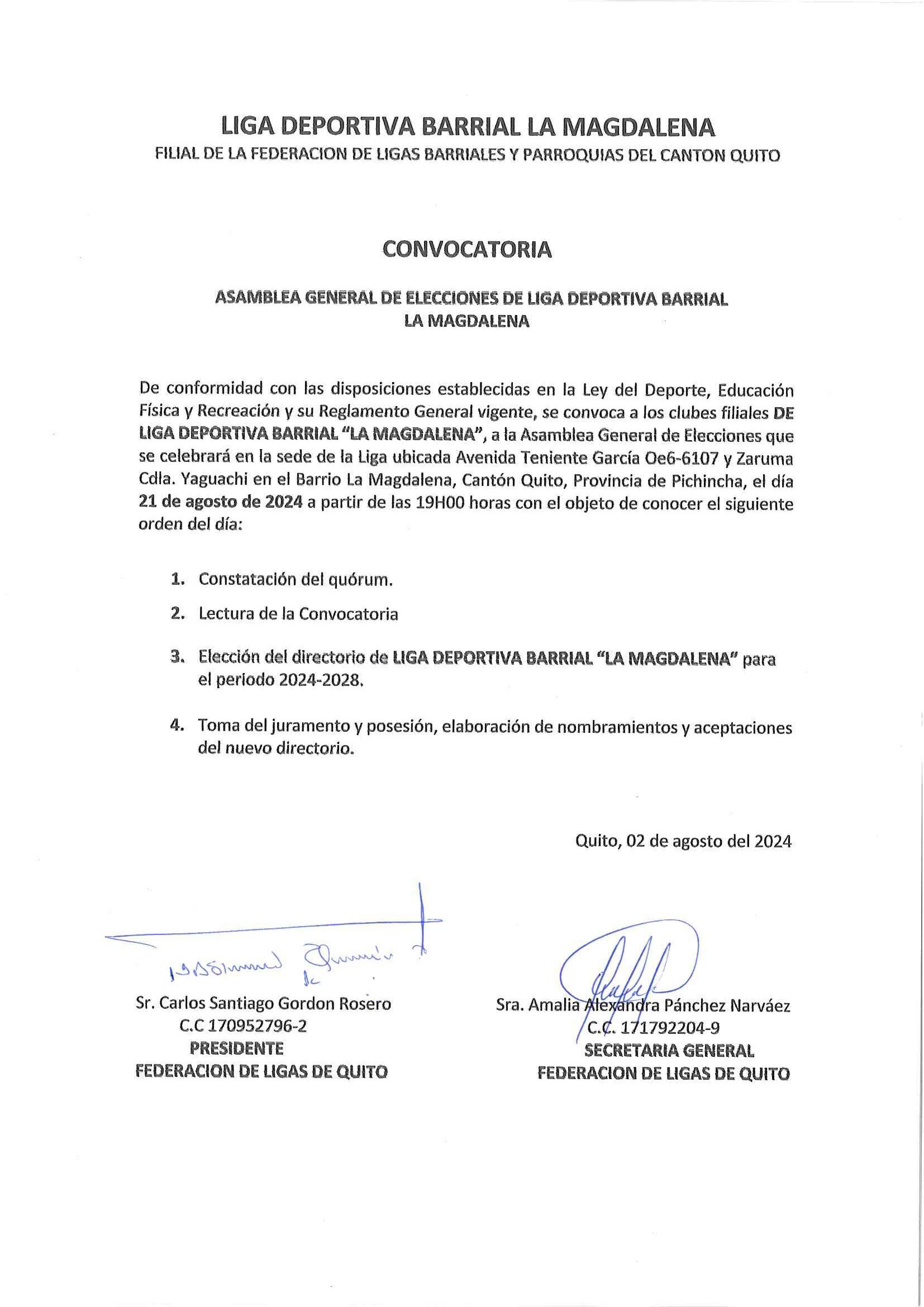 De conformidad con las disposiciones estatutarias se convoca a los clubes jurídicos filiales de la LIGA DEPORTIVA BARRIAL RODRIGO PAZ a la Asamblea General de Elecciones que se celebrará el día 20 de agosto de 2024 a partir de las 16:00 en la dirección: VIA A CRUZ LOMA OE3-64