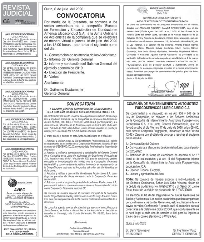Se convoca de manera especial e individual al señor comisario de la Compañía Angel Mauricio Paredes Osejo a la junta ordinaria. Quito, 01 de agosto del 2024.