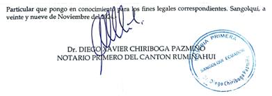 Ahora bien, de conformidad con la Ley y las atribuciones a mi conferidas, y según lo establecido en el Código Orgánico General de Procesos, publíquese por tres días consecutivos el extracto de la escritura pública de Disolución Voluntaria y Liquidación de la SOCIEDAD CIVIL Y COMERCIAL AGROPECUARIA AMANCA S.C.C.., otorgada con fecha 27 dc noviembre de 2024, ante el Dr. Alexis Patricio Jurado Vaca, Notario Octogésimo Cuarto del cantón Quito, en uno de los diarios de mayor circulación de esta ciudad de Quito.