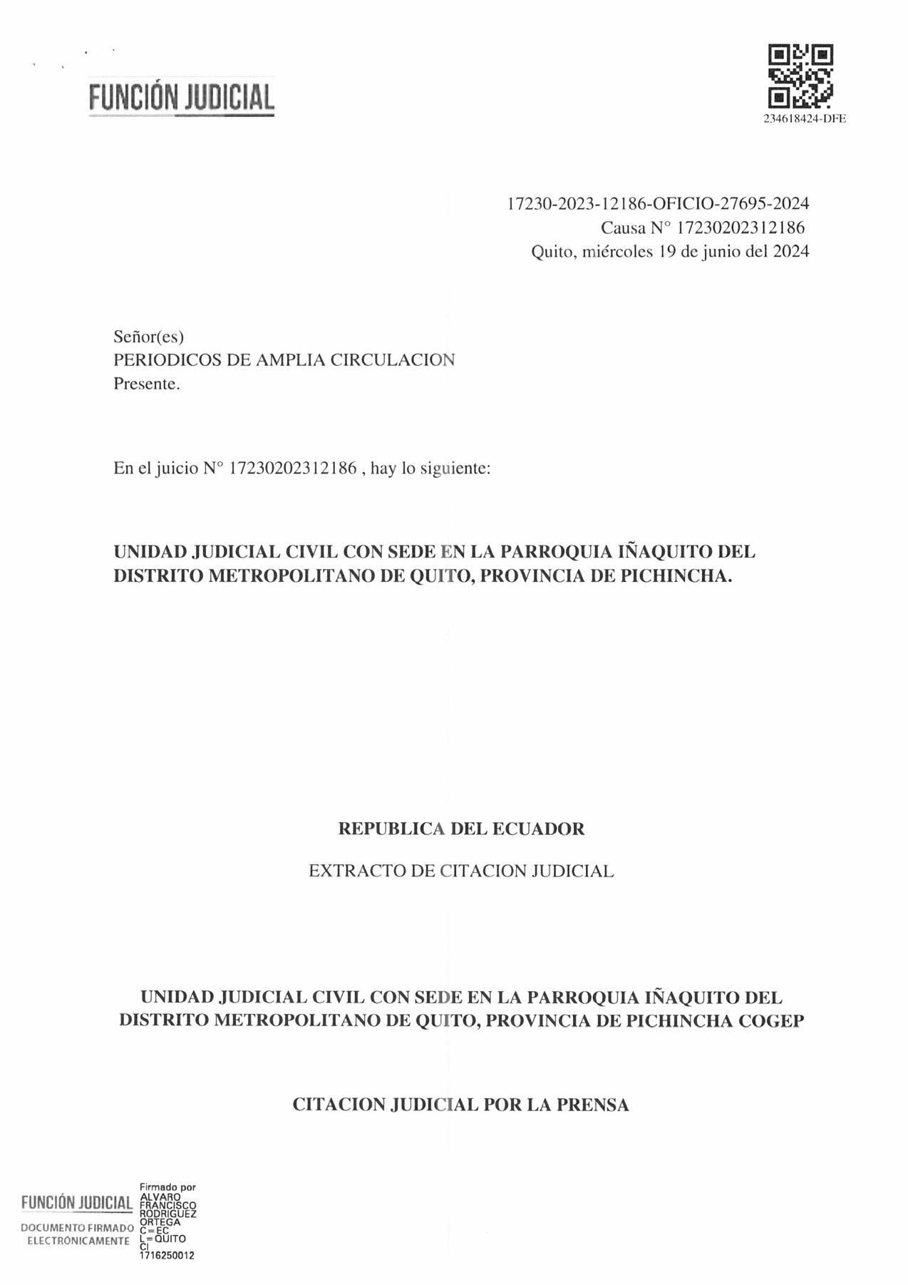 UNIDAD JUDICIAL CIVIL CON SEDE EN LA PARROQUIA IÑAQUITO DEL DISTRITO METROPOLITANO DE QUITO, PROVINCIA DE PICHINCHA. Quito, viernes 17 de mayo del 2024, a las 16h09. REPUBLICA DEL ECUADOR