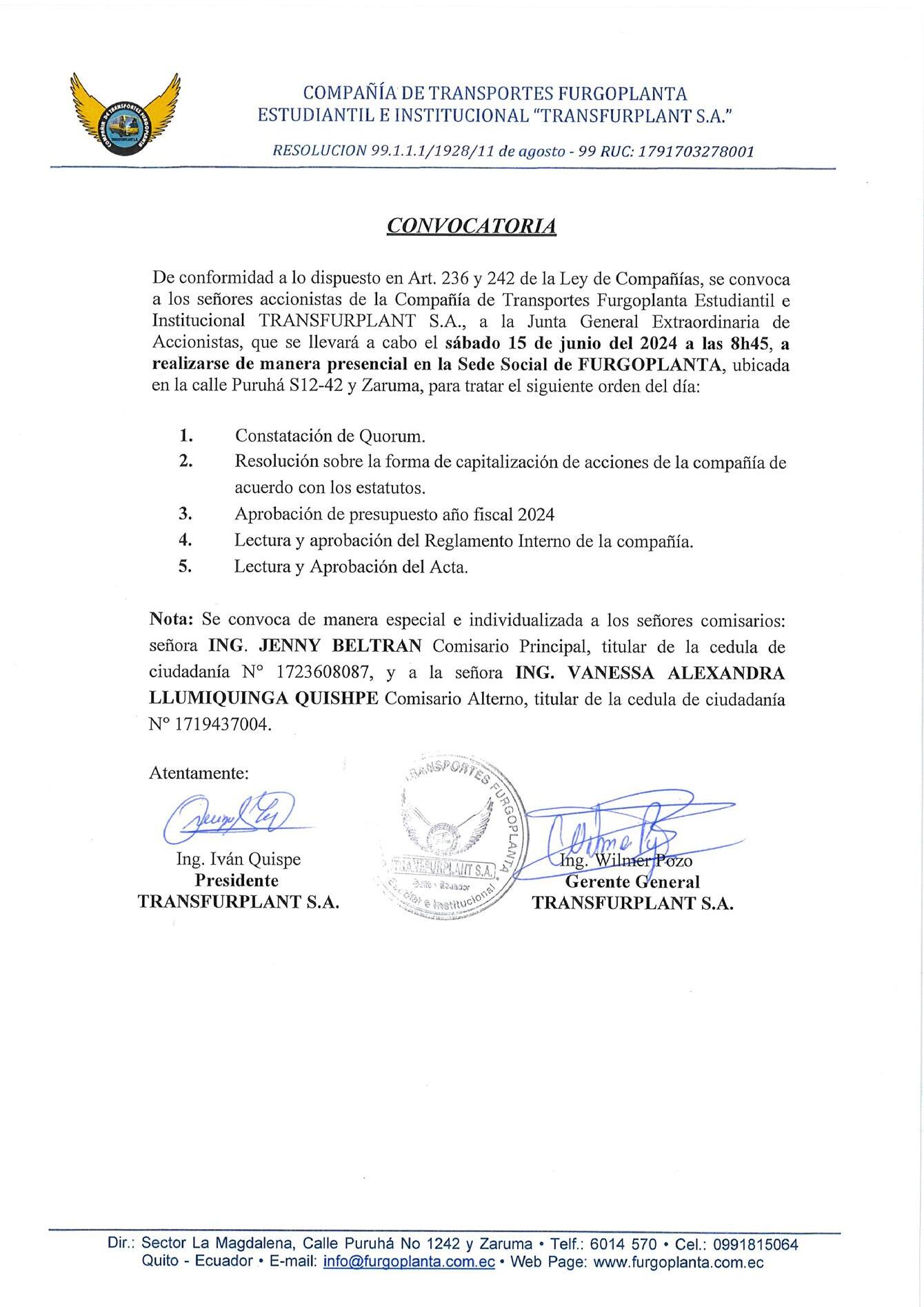 Sin perjuicio de la publicación de esta convocatoria, se convocará personalmente al señor Byron Catagña Comisario de la Compañía, a través de correo electrónico, a sus direcciones registradas en la compañía.