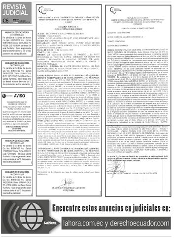 CITESE a los herederos presuntos y desconocidos de los CAUSANTES MANUEL RENE CARDENAS ROGEL Y LUIS ALBERTO CARDENAS JUMBO, mediante tres publicaciones que se realizaran en tres fechas distintas en uno de los periódicos diarios de mayor circulación que se editan en la ciudad de quito, provincia de pichincha, de conformidad con el art 56 n 1 y art. 58, para que comparezcan a juicio