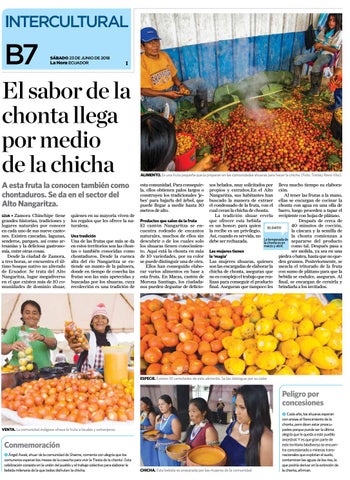 sos helados, muy solicitados por lleva mucho tiempo su elaborapropios y extraños.En el Alto ción. Nangaritza, sus habitantes han Al tener las frutas a la mano, buscado la manera de extraer ellas se encargan de cocinar la el condensado de la fruta, con el chonta con agua en una olla de cual crean la chicha de chonta. barro, luego proceden a tapar el La tradición shuar revela recipiente con hojas de plátano. que ofrecer esta bebida Después de cerca de es un honor; para quien EL DATO 40 minutos de cocción, la recibe es un privilegio. la cáscara y la semilla de Así, cuando es servida, no la chonta comienzan a La temporada de separarse del producto debe ser rechazada. la chonta es en marzo y abril. como tal. Después pasa a ser molida, ya sea en una Las mujeres tienen piedra o batea, hasta que no quela ‘magia’ Las mujeres shuaras, quienes den grumos. Posteriormente, se son las encargadas de elaborar la mezcla el triturado de la fruta chicha de chonta, aseguran que con sumo de plátano para que la no es complejo el trabajo que rea- bebida se endulce, aseguran. Al lizan para conseguir el producto final, se encargan de cernirla y final. Aseguran que tampoco les brindarla a los invitados.