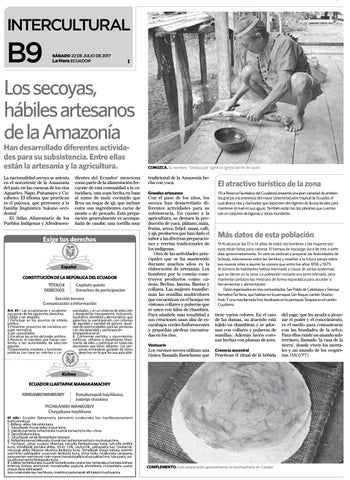 Los secoyas, hábiles artesanos de la Amazonía Han desarrollado diferentes actividades para su subsistencia. Entre ellas están la artesanía y la agricultura. La nacionalidad secoya se asienta en el nororiente de la Amazonía del país, en las cuencas de los ríos Aguarico, Napo, Putumayo y Cuyabeno. El idioma que practican es el paicoca, que pertenece a la familia lingüística ‘tukano occidental’. El ‘Atlas Alimentario de los Pueblos Indígenas y Afrodescen-