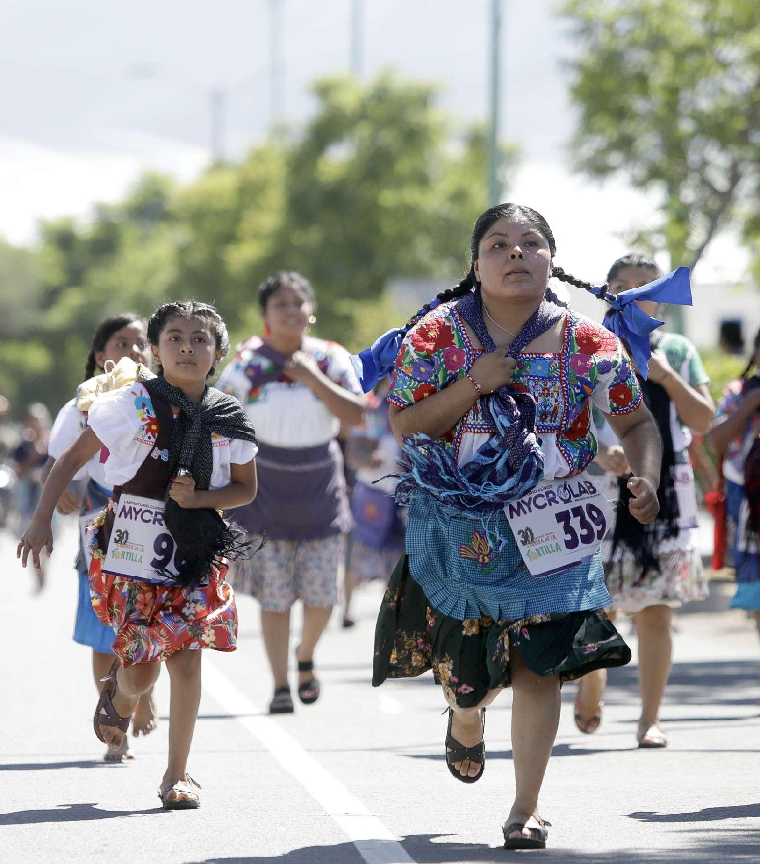 mujeres coapeñas corren en la tradicional ‘Carrera de la tortilla’ este domingo (4 de agosto), en el poblado de Santa maría Coapan, municipio de tehuacán, Puebla (méxico). más de 400 mujeres y niñas participaron en la ‘Carrera de la tortilla’ en el estado de Puebla (centro de méxico), donde corrieron 5 kilómetros con un canasto en la espalda lleno de este producto de maíz, para honrar la tradición de su elaboración. EFE/ Hilda ríos