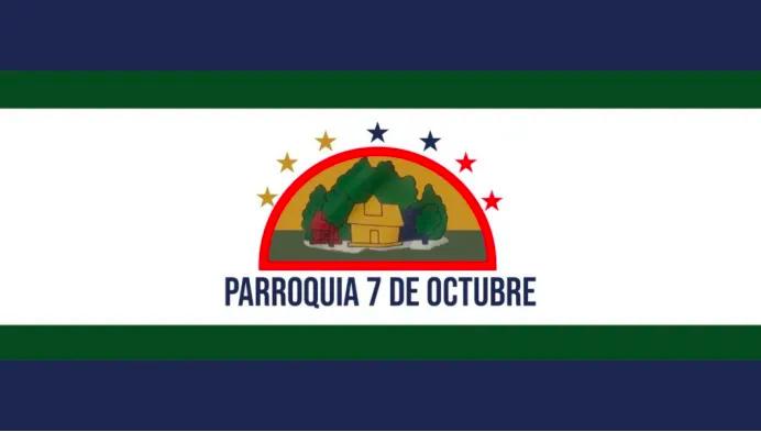 céntrica así mismo se ubica una tercera franja que es la de color blanco, en la parte central de la bandera en la franja blanca se hace notar el logotipo del Instituto Tecnológico Superior 7 de Octubre, entidad publica al servicio de la educación, aquí notamos la combinación del tricolor nacional, un bosque, siete estrellas y el nombre de la parroquia.