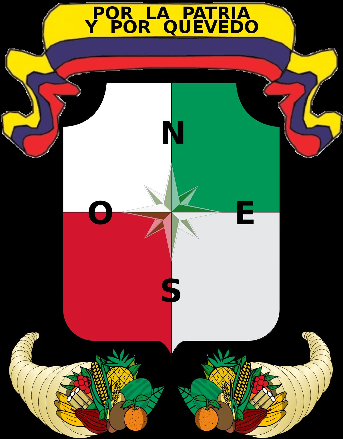 Une los cuatro cuarteles una rosa de los vientos, indicando la importancia vial propia de Quevedo. A los pies del Escudo se encuentran dos cuernos de la abundancia, frente a frente.