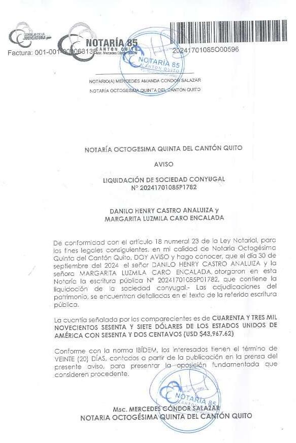 De conformidad a lo previsto en el Artículo 18, Numeral 23 de la Ley Notarial, se hace conocer al público en general y de manera especial a quien tenga interés, que se va a proceder a la inscripción de la LIQUIDACIÓN DE SOCIEDAD DE BIENES EN UNIÓN DE HECHO, habida entre los señores: ALEX FERNANDO ARTETA RODRÍGUEZ y LISBETH CAROLINA CAMACHO IZQUIERDO; convenio celebrado mediante escritura pública otorgada en la NOTARIA TERCERA DEL CANTÓN ZAMORA, el día 03 de octubre de 2024, y que comprende sobre el siguiente bien: Uno.- Inmueble signado con el número 9, de la Manzana “C”, ubicado en el barrio Tunantza, parroquia Zamora, cantón Zamora, provincia de Zamora Chinchipe, adquirido mediante escritura pública de fecha viernes dieciocho de marzo de dos mil veintidós, ante la Notaría Pública Segunda del cantón Zamora, e inscrita en el Registro de la Propiedad del cantón Zamora el día lunes veintiuno de marzo de dos mil veintidós, bajo el Tomo 8 – 2022, Folio 3490 – 3507, Número de Inscripción ciento sesenta y dos (162), Número Repertorio trescientos ochenta y ocho (388); propiedad que está comprendida con los siguientes linderos y dimensiones: NORTE: con el predio número 2, en la extensión de seis punto veinticinco metros (6.25 m.); y, con el predio número 3, en la extensión de seis punto veinticinco metros (6.25 m.); SUR: con la calle “L”, en la extensión de doce punto cincuenta metros (12.50 m.); ESTE: con el predio número 8, en la extensión de veinte punto cuarenta y un metros (20.41 m.); y, OESTE: Con el predio número 10, en la extensión de veinte punto treinta y nueve metros (20.39 m.).- Con una superficie de DOSCIENTOS CINCUENTA Y CINCO PUNTO CERO DOS METROS CUADRADOS (255.02 M2). Dos.- Por cuanto a la señora Lisbeth Carolina Camacho Izquierdo, no se le adjudica bien inmueble, el acuerdo incluye también que, a ella se le entrega una compensación económica de $ 9.434,78, que es el monto que le corresponde a su parte proporcional, valor que ha sido entregado en dinero de curso legal a satisfacción. Los interesados podrán oponerse en el término de veinte días contados a partir de la presente publicación. Lo que se hace conocer para los fines legales consiguientes.