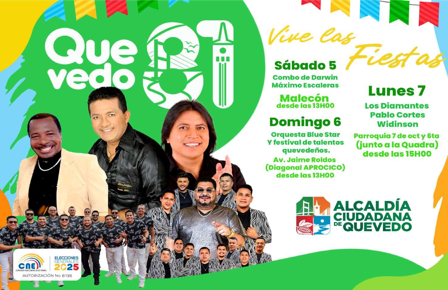 y la orquesta del Combo de Darwin ofrecieron espectáculos vibrantes que mantuvieron a todos en movimiento y disfrutando de la música. El domingo 6 de octubre, la diversión no cesó; la orquesta Blue Star subió al escenario, complementando el evento con un festival de talentos quevedeños en la Av. Jaime Roldós, donde los artistas locales brillaron y mostraron su talento.
