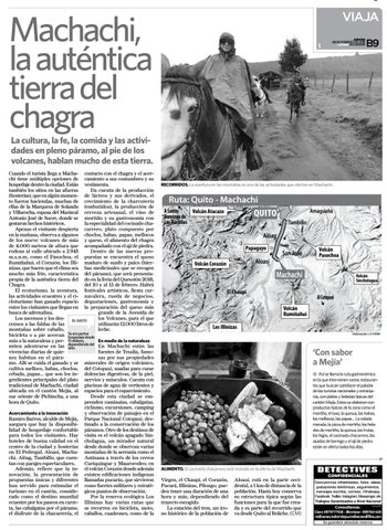 Cuando el turista llega a Macha- contacto con el chagra y el acerchi tiene múltiples opciones de camiento a sus costumbres y su hospedaje dentro la ciudad. Están vestimenta. Da cuenta de la producción también los sitios en las afueras (hosterías), que en algún momen- de lácteos y sus derivados, el to fueron haciendas, muchas de crecimiento de la charcutería ellas de la Marquesa de Solanda (embutidos), la producción de y Villarocha, esposa del Mariscal cerveza artesanal, el vino de Antonio José de Sucre, donde se mortiño y su gastronomía con la especialidad del cocinado chagestaron hechos históricos. Apenas el visitante despierta carrero, plato compuesto por en la mañana, observa a algunos choclos, habas, papas, mellocos de los nueve volcanes de más y queso, el alimento del chagra de 4.000 metros de altura que acompañado con el ají de piedra. Dentro de las nuevas prorodean al valle ubicado a 2.945 m.s.n.m, como el Pasochoa, el puestas se encuentra el queso Rumiñahui, el Corazón, los Illi- maduro de sunfo y paico (hiernizas, que hacen que el clima sea bas medicinales que se recogen mucho más frío, característica del páramo), que será presentapropia de la auténtica tierra del do en la feria del Quesotón 2018, del 10 y al 13 de febrero. Habrá Chagra. El ecoturismo, la aventura, festivales artísticos, fiesta carlas actividades ecuestres y el ci- navalera, rueda de negocios, cloturismo han ganado espacio degustaciones, gastronomía y entre los visitantes que llegan en la preparación del queso más grande de la Avenida de busca de adrenalina. los Volcanes, para el que Los ascensos y los des- EL DATO utilizarán 12.000 litros de censos a las faldas de las leche. montañas sobre caballo, encuentra bicicleta o a pie acercan Se hospedaje desde más a la naturaleza y per- 15 dólares, En medio de la naturaleza del miten adentrarse en las dependiendo En Machachi están las sitio. vivencias diarias de quiefuentes de Tesalia, famones habitan en el párasas por sus propiedades mo. Allí se cuida el ganado y se minerales de origen volcánico, cultiva melloco, habas, choclos, del Cotopaxi, usadas para curar cebada, papas… que son los in- dolencias digestivas, de la piel, gredientes principales del plato nervios y músculos. Cuenta con tradicional de Machachi, ciudad piscinas de agua de vertientes y ubicada en el cantón Mejía, al espacios para el esparcimiento. sur oriente de Pichincha, a una Desde esta ciudad se emhora de Quito. prenden caminatas, cabalgatas, ciclismo, excursiones, camping y observación de paisajes en el Acercamiento a la innovación Ramiro Barros, alcalde de Mejía, Parque Nacional Cotopaxi, desasegura que hay la disponibi- tinado a la conservación de los lidad de hospedaje confortable páramos. Otro de los destinos de para todos los visitantes. Hay visita es el volcán apagado Sinhoteles de buena calidad en el cholagua, un mirador natural centro de la ciudad y hosterías desde donde se observan varias en El Pedregal, Aloasí, Macha- montañas de la serranía como el chi, Alóag, Tambillo, que cuen- Antisana a través de los cerros Curiquingue y Maurorodeo; en tan con parajes espectaculares. Además, refiere que la in- el volcán Corazón donde además novación, la presentación de existen edificaciones indígenas propuestas únicas y diferentes llamadas pucarás, que sirvieron han servido para estimular el como fuertes militares y estratéturismo en el cantón, conside- gicos puntos de observación. Por la reserva ecológica Los rado como el destino mundial ecuestre por los paseos en carre- Illinizas hay varias rutas que ta, las cabalgatas por el páramo, se recorren en bicicleta, moto, el disfrute de la chacarrería, el caballos, cuadrones, como de la