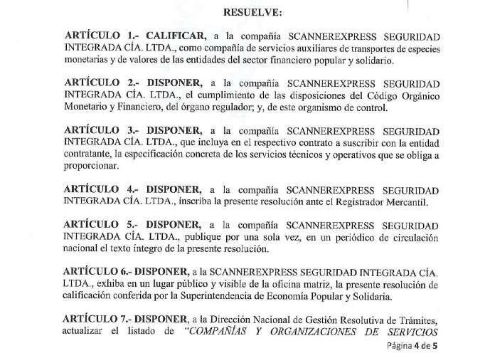 SCANNEREXPRESS SEGURIDAD INTEGRADA CÍA. LTDA. Da a conocimiento público la presente resolución de calificación conferida por la Superintendencia de Economía Popular y Solidaria. Dicha resolución se marginó en la inscripción original de constitución de la referida campañía inscrita el 12 de febrero de 1999 con el número 99 de este registro.