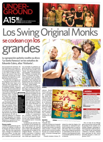 grandes La agrupación quiteña reedita su disco ‘La Santa Fanesca’ en los estudios de Eduardo Cabra, alias ‘Visitante’. Son la banda del momento. No nos escuchaba, le podíamos suhay festival que no los quiera te- gerir una idea y él la desarrollaner sobre el escenario, aparecen ba. Un ‘man’ muy sencillo y muy en las publicaciones de moda y ‘bacán’, con mucha paciencia y en las calles se habla de ellos... muy humilde”, comenta FernánParece que tienen el don de la dez. “Visitante es un genio de la ubicuidad, al igual que el todo- música, escuchaba un tema, a poderoso. Pero gozar de ese atri- veces introducía una modificación mínima, como una nueva buto divino tiene su precio… La entrevista con algunos de percusión, o bien suprimía una los miembros de los Sweet Ori- pequeña parte de la canción, de ginal Monks tiene lugar en la repente la canción sonaba mucafetería del Ochoymedio. Se cho mejor”, añade Obadía. La reedición de ‘La Santa Fapresentan puntuales, pero con el semblante cansado. Llegaron nesca’ que realizaron en Puerto la noche anterior (miércoles) de Rico llega con sorpresas. Por un Puerto Rico, donde permanecie- lado trabajaron el disco sin cambiar su esencia, como exron 10 días reeditando su celebrado disco ‘La Santa TOME NOTA plicaba Greenfield, en este proceso enfatizaron las Fanesca’ junto a Eduarsensaciones del directo, do Cabra, más conocido 13, allí donde los Monks descomo Visitante’, integran- Calle Molotov, te de la formación Calle 13. Vicentico y los pliegan todo su arsenal. Original Pero también incluyeron A la cita acuden Gon- Swing Monks se prealgo más, pues el disco, zalo Fernández (bateris- sentarán en el Festival Alter que estará finalizado en ta), Ilán Greenfield (cuer- Fest, el 16 de en el diciembre y se lanzará das y percusión), Álvaro octubre, Estadio Olímpico a principios de marzo, Obadía (guitarra) y José Atahualpa, a de las Cruz (mánager). Se dejan partir 18:00. La entra- incluirá siete nuevos tecaer sobre las sillas, como da más econó- mas. “Al principio, en las cuesta 28 charlas que teníamos por si la fuerza de la grave- mica dólares. Skype la idea era reeditar dad ejerciera una presión el disco, le comentamos sobrenatural. El café en agua que pidieron se volatilizó que teníamos material nueen pocos segundos. Los cantan- vo, él lo escuchó y nos dijo que tes, Nathalia Madrigal y Gabriel ‘de una’ que también grabaríaBaumann, se quedaron en Puer- mos material nuevo”, recuerda Greenfield. to Rico grabando las voces. La historia que precede a haber grabado con un miembro de Proceso creativo Al hablar de la grabación que hi- una de las bandas de rock rap cieron con Visitante, el rostro se más importantes del planeta les ilumina de manera sincroni- parece haber sido fabulada por zada. “Ha sido una experiencia un guionista de la estirpe de los única, trabajar con Visitante ha Original Monks. En mayo, la sido maravilloso. Un tipo muy banda actuó junto a Guamaco meticuloso y perfeccionista, en Carondelet, con motivo de pero también una persona que una velada que organizó el pre-