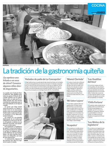 ‘Helados de paila de La Concepción’ ° Algo tradicional que no puede dejar de lado durante las fiestas son los helados y los que han alcanzado fama son los de La Concepción. Se trata de un pequeño local con más de 20 años de funcionamiento. Se dice que son legítimos, hechos en paila y con fruta natural. En el sitio también puede deleitarse de un café con humitas y los clásicos barquillos para acompañar el helado. Dirección: junto al Parque de La Concepción, en la Santiago Duarte OE3-25 y Avenida Brasil.