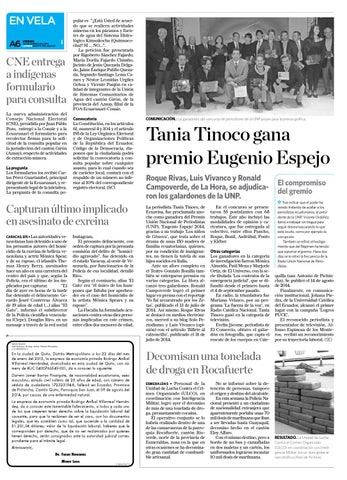 Tania Tinoco gana premio Eugenio Espejo Roque Rivas, Luis Vivanco y Ronald Campoverde, de La Hora, se adjudicaron los galardones de la UNP. La periodista Tania Tinoco, de Ecuavisa, fue proclamada anoche como ganadora del Premio Unión Nacional de Periodistas (UNP), ‘Eugenio Espejo’ 2014, gracias a su trabajo ‘Los niños de Génova’, que trata sobre el drama de unas 150 madres de familia ecuatorianas, quienes, por su condición de inmigrantes, no tienen la tutela de sus hijos nacidos en Italia. Ante un aforo completo en el Teatro Gonzalo Bonilla también se entregaron premios en varias categorías. La Hora alcanzó tres galardones. Ronald Campoverde logró el primer lugar en prensa con el reportaje ‘Yo fui secuestrado por los Zetas’, publicado el 13 de julio de 2014. Así mismo, Roque Rivas se destacó en medios electrónicos, merced a su blog Solo Periodismo, y Luis Vivanco (opinión) con el artículo ‘Billete al calzoncillo’, publicado el 31 de julio de 2014.