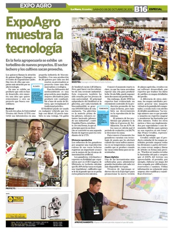 de biodiésel cuesta 1,25 dólares. Conocer el momento exacto es Pero ¿qué hacer con los sobran- clave, ya que las vacas necesitan tes de esta creciente industria?. esperar una cría para producir Esta respuesta también ha leche. Si esto falla, puede suponer sido resuelta por los jóvenes de unos dos meses sin producción. esta universidad. El principal Sin embargo, desde 1992 los subproducto del biodiésel es la expertos han evidenciado un glicerina, por cada tonelada de crecimiento sostenido de la probiocombustible se geneducción promedio de las ran 100.000 kilos de esta toME Nota razas lecheras, pero tamsustancia. “La glicerina bién un decrecimiento es la materia prima de Expoagro estará en la reproducción de las los jabones, entonces es- abierta hasta mismas. en la tamos haciendo jabones mañana El primero de los proavenida de uso industrial”, contó Amazonas y blemas que plantea es la en Franklin Flores, estudian- Atahualpa, falla en el proceso de ferQuito. te. De esta forma, lo que al tilización. En un 8.7% de principio parecía un deselos casos se calcula mal el cho se convirtió en una segunda periodo de ovulación y en 24.7% fuente de ingresos para los estu- se desconoce la causa. diantes de la UTN. Para conocer el momento, los ganaderos cuentan con tecnología de punta que les alertará Eficiencia reproductiva Los esfuerzos de los ganaderos cuándo las vacas sufren aumenpor asegurar una reproducción tos en su temperatura corporal, exitosa de sus vacas lecheras cambio que se produce cuando registran un importante avance las vacas están listas para ser incon la mejora de las técnicas de seminadas. inseminación artificial. Los ganaderos, veterinarios y Mapas digitales expertos en fertilidad que expu- Una de las herramientas más sieron ayer en el III Congreso de sofisticadas para administrar Eficiencia en Lechería calculan grandes haciendas está cada vez que 15 y 16% de las vacas en el país más disponible en el país. son ‘repetidoras’, calificativo que Técnicos de Agromaps se se le da al ganado que no se preña dieron cita en la ExpoAgro para en los primeros tres intentos. promocionar la nueva versión