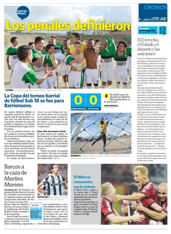 La Copa del torneo barrial de fútbol sub 18 se fue para barrionuevo. EL ‘punto fatídico’ definió al campeón barrial de fútbol categoría Sub 18. Barrionuevo corrió ayer con más fortuna que Atucucho y levantó la Copa. El partido se disputó en el estadio de la Federación de Ligas (norte de Quito). Fue un partido intenso, los dos cuadros crearon posibilidades de gol, pero la ineficacia quedó en evidencia. Quién levantaba la Copa, eso tuvo que definirse desde el manchón del penal. En las gradas se vivía otra fiesta, las dos barras apoyaban incansablemente, pero serían los ‘sureños los que terminarían festejando. El equipo de Barrionuevo
