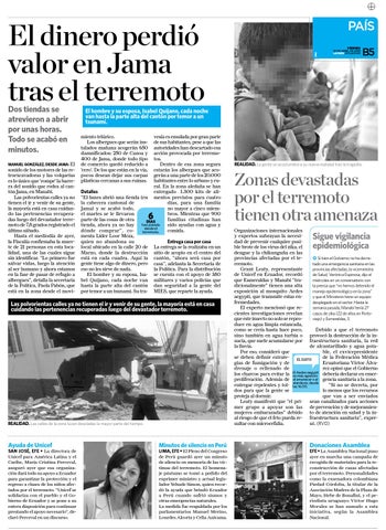 vesía es emulada por gran parte de sus habitantes, pese a que las autoridades han descartado esa acción provocada por terremotos. Dentro de esa zona segura estarán los albergues que acogerán a una parte de los 20.000 habitantes entre lo urbano y rural. En la zona aledaña se han entregado 1.300 kits de aliDetalles “El lunes abrió una tienda (en mentos previstos para cuatro días, para una familia la cabecera cantonal de no mayor a cinco miemJama) y se acabó todo, bros. Mientras que 900 el martes se le llevaron familias citadinas han parte de las cosas de otra DÍAS han pasado sido ayudas con agua y tienda, ahora ya no hay desde el comida. dónde comprar”, coterremoto. menta Líder Loor Meza, quien no abandona su Entrega casa por casa local ubicado en la calle 20 de La entrega se la realizaba en un Marzo, donde la destrucción sitio de acopio en el centro del está en cada cuadra. Aquí la cantón, “ahora será casa por gente tiene algo de dinero, pero casa”, adelanta la Secretaria de eso no les sirve de nada. la Política. Para la distribución El hombre y su esposa, Isa- se cuenta con el apoyo de 380 bel Quijano, cada noche van militares y varios policías que hasta la parte alta del cantón dan seguridad a la gente del por temor a un tsunami. Su tra- MIES, que reparte la ayuda.