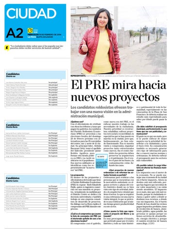 como nueva era del PRE, es el Con el ofrecimiento de retribuir enfocar nuestro trabajo en las con obras los tributos y tasas que necesidades de la ciudadanía. pagan los quiteños, los canidatos Nuestra prioridad es reestrucdel Partido Roldosista Ecuato- trar, rehabilitar, enfocar proyecriano (PRE) se presentan a las tos en lo social y en movilidad, en elecciones locales del domingo especial los que se han puesto en 23 de febrero próximo con al- marcha en la ciudad, pero que, ternativas para las 15 concejalías lastimosamente, no han estadel centro, sur y norte de la ciu- do funcionando. Ésa es nuestra dad. Su principal líder, Abdalá visión y compromiso, impulsar Bucaram Ortiz, tomó el apellido proyectos tanto estructurados del fallecido presidente Jaime como nuevos. En el centro histórico los proyectos deben Roldós Aguilera para preservar la arquitectura formar esta tienda políti- EL DATO y el patrimonio. En el cenca en 1983 y no tardó en tro el paso de los buses y la ubicarse en el populismo. listas de PRE contaminación están daSus nuevos militantes se Las aparecen en la identifican como los re- papeleta con el ñando las casas. presentantes de “la nueva número 10 era” del PRE. ¿Qué proyectos de nuevas Las propuestas