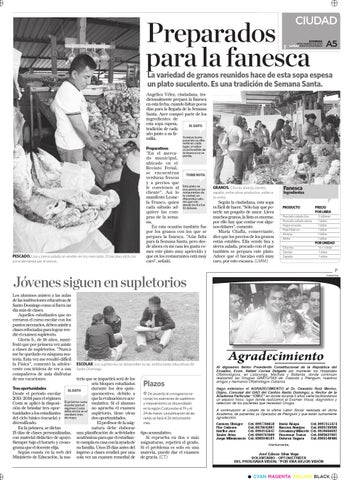 lugar, el sabor Preparativos inconfundible de “En el merca- la fanesca no se pierde. do municipal, ubicado en el Recinto Ferial, se encuentran TOME NOTA verduras frescas y a precios que plato se le convienen al Este encuentra en los cliente”. Así lo restaurantes de ciudad, en manifestó Leone- la diferentes valores que van la Franco, quien desde los 8 a los cada sábado ad- 10 dólares. quiere las compras de la semana. En esta ocasión también fue por los granos con los que se prepara la fanesca. “Aún falta para la Semana Santa, pero desde ahora en mi casa les gusta comer este plato muy apetecido y que en los restaurantes está muy caro”, señaló.
