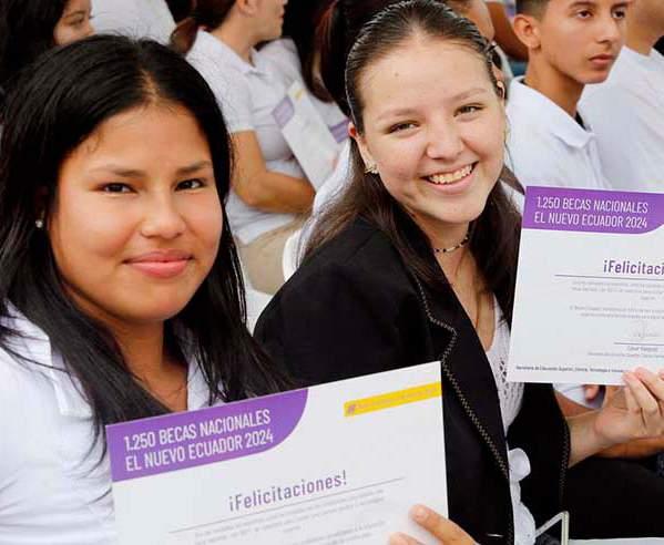 ratificó su objetivo de crear nuevas plazas de empleo. Génesis Guanoluisa fue una de las becarias beneficiadas y agradeció al Gobierno Nacional por esta ayuda para continuar sus estudios.