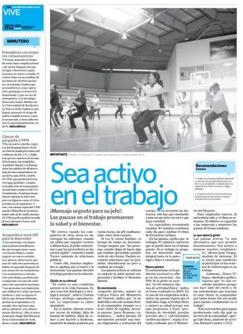 cuerpo. No es necesario un ins- rio del Deporte. tructor, sólo hay que enseñarles Para empleados nuevos, la a unir un ejercicio con otro y que autoestima sube y el clima se arhaya variedad. moniza. El objetivo es capacitar La especialista recomienda a las empresas y mantener las caminar 30 minutos continuos pausas de forma continua. cada día para cambiar el ritmo de frecuencia cardiaca. lo que opina la gente En las pausas, explica que se Las pausas activas “es una trabajan 10 minutos concretos alternativa que nos permite que se puede hacer en el mismo desestresarnos. Nos motiva a puesto. Si se trabaja en grupo, mejorar nuestro rendimienhay un desarrollo más to”, afirma Juan Vargas, integral tanto en lo psico- TOME NOTA analista de sistemas. Él lógico, físico y emocional. se siente muy satisfecho al participar en las sesioContactos: nes de bailoterapia en su nunca quietos Dra. Amparito trabajo. El sedentarismo en la po- Jácome Asimismo, Álvaro Viblación nacional se refle- Teléfono: 02-396-9200/ llegas, diseñador gráfico, ja en las encuestas. Así, ext. 2082 expresa que “es una ex93% de la gente no praccelente iniciativa porque tica “ni 30 minutos diarios de actividad física”, indica nos hace salir del estrés y de el Censo realizado en 2010. En ese sedentarismo que tenemos el caso de los empleados seden- al estar frente al computador tarios, las pausas logran que el por tantas horas. Eso nos ayuda individuo haga actividad física para nuestro rendimiento en el y mejore su salud porque son trabajo”. “Esto nos reactiva para seguir más propensos a tener “problemas de obesidad, presión produciendo cada día más en arterial alta y enfermedades servicio de la comunidad”, agrecardiovasculares”, según el es- ga Galo Sosa, asistente de servitudio realizado por el Ministe- cios. Richard Condor (USFQ)