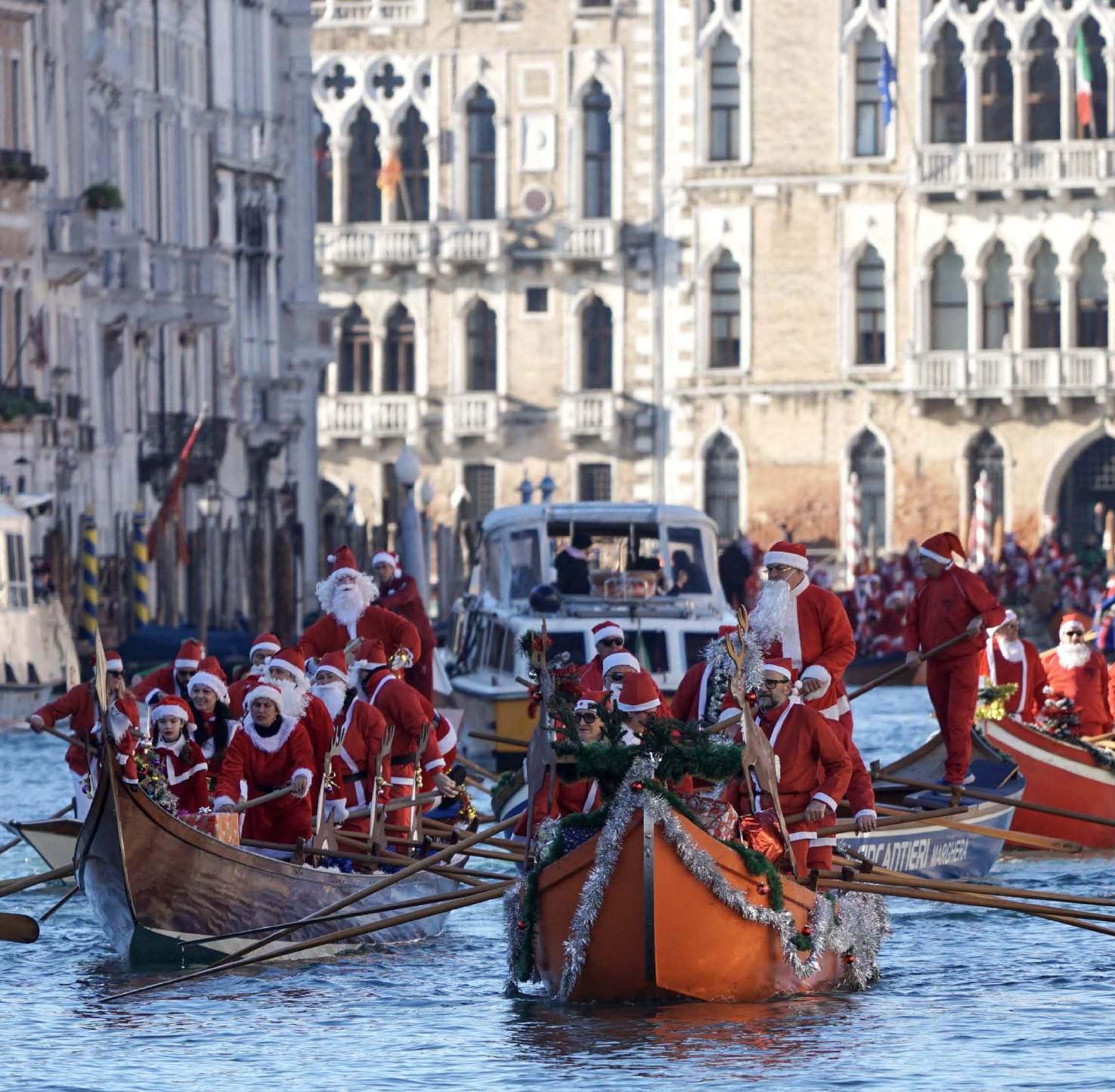 Miembros de asociaciones venecianas de remo, vestidos de Papá noel navegan en góndolas, durante la regata de santa Claus en el Gran Canal, en Venecia, Italia, 17 de diciembre de 2023. eFe