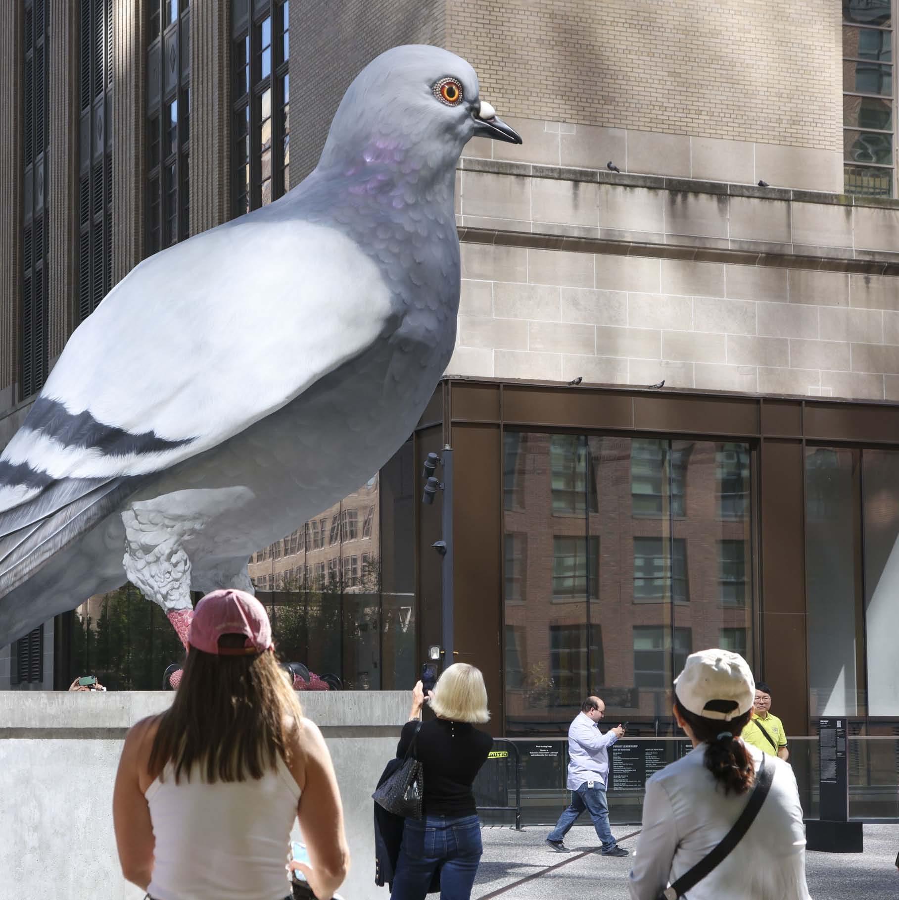 la gente pasa por ‘dinosaurio’, una escultura hiperrealista de una paloma fundida en aluminio y creada por el artista colombiano-francés ivan argote. la obra se exhibirá en el high line plinth en nueva York (ee.UU.) durante 18 meses. eFe