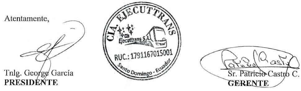 De conformidad con lo previsto en los artículos 119 y 236 de la ley de Compañías y del estatuto Social, se convoca a los señores accionistas de la Compañía Ejecuttrans S.A., a Junta General Ordinaria, que tendrá lugar en la Sede de la Compañía ubicado en la Av. Tsafiqui y Abraham Calazacón, para el día miércoles 03 de abril de 2024 a las 10:30 a.m., para tratar el siguiente orden del día: