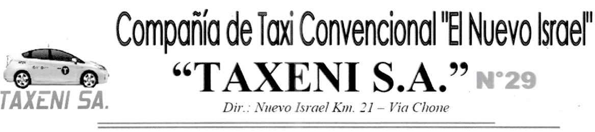 Se convoca con carácter urgente y obligatorio a una Junta General Extraordinaria de accionistas y socios de la Compañía de Taxi convencional “El nuevo Israel” TAXENI S.A. N° 29, a llevarse efecto el día Viernes 07 de Junio del 2024 a partir de las 10:00 am en el local de sesiones de nuestra Institución ubicada en el km. 21 de la vía Chone Recinto Nuevo Israel para tratar el siguiente orden del día.