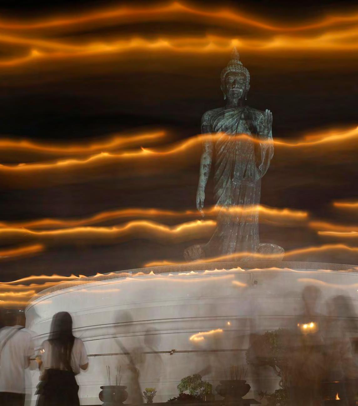 Fotografía de larga exposición de un grupo de budistas rezando frente a una estatua gigante de Buda, los devotos portan velas y caminan en círculos durante la ceremonia de encendido de velas para celebrar el día Budista de Vesak en Buddhamonthon, en la provincia de Nakhon Pathom. (EFE/ Narong Sangnak)