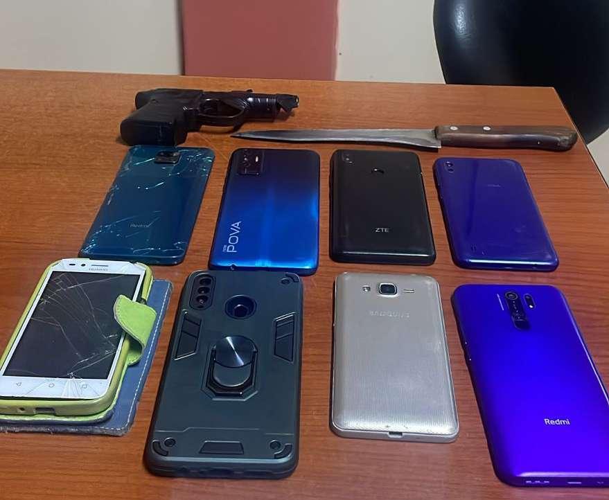 En su poder la Policía encontró ocho celulares, un cuchillo y un objeto plástico similar a una pistola. Adicionalmente los detenidos fueron reconocidos por las víctimas.