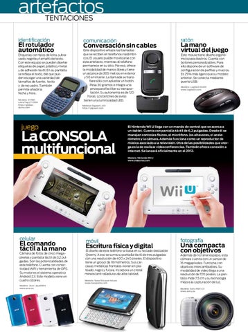 El nintendo Wii U llega con un mando de control que se acerca a un tablet. cuenta con pantalla táctil de 6,2 pulgadas. Desde él se manejan controles físicos, el micrófono, los altavoces, el acelerómetro y la cámara. además funciona como un reproductor de música asociado a la televisión. otra de las posibilidades que otorga es la de realizar videoconferencias. También ofrece conexión a internet. se lanzará oficialmente en el 2012. Modelo: nintendo Wii U www.vidaextra.com