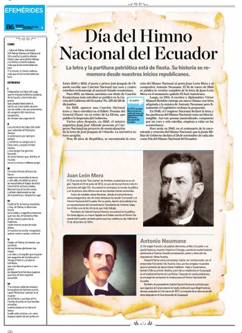 Entre 1830 y 1832, el poeta y prócer José Joaquín de Ol- ción del Himno Nacional al poeta Juan León Mera y al medo escribe una Canción Nacional (un coro y cuatro compositor Antonio Neumane. El 16 de enero de 1866 se publica la versión completa de la letra de Juan León estrofas) en homenaje al naciente Estado ecuatoriano. Para 1833, un himno anónimo con título de Canción Mera en el semanario quiteño El Sud Americano. Luego, en 1913, el escritor y diplomático Víctor Ecuatoriana (seis estrofas) se publicó en la GaManuel Rendón entrega un nuevo himno con letra ceta del Gobierno del Ecuador No. 125 del 28 de EL DATO adaptada a la música de Antonio Neumane pero fidiciembre. En 1838, aparece una Canción Nacional En 1977, se esta- nalmente el Legislativo rechaza la propuesta. En 1948, el Congreso Nacional declaró la letra y (coro y cinco estrofas) en el folleto ‘Poesías del blece el que se cante el coro y la General Flores’ en su retiro de La Elvira, que segunda estrofa las partituras del Himno Nacional como un bien indel Himno tangible. Así este poema musicalizado, compuesto publicó la Imprenta del Gobierno. Nacional del por un coro y seis estrofas, empieza a calar en los Varios años después, en 1865, el músico Ecuador. ecuatorianos. argentino Juan José Allende presenta al ConPero sería en 1965, en el centenario de la encogreso Nacional un proyecto de musicalización de la letra de José Joaquín de Olmedo. La iniciativa no mienda y creación del Himno Nacional, que la Junta Militar de Gobierno declara el 26 de noviembre de cada año tuvo acogida. Tras 35 años de República, se encomienda la crea- como Día del Himno Nacional del Ecuador.