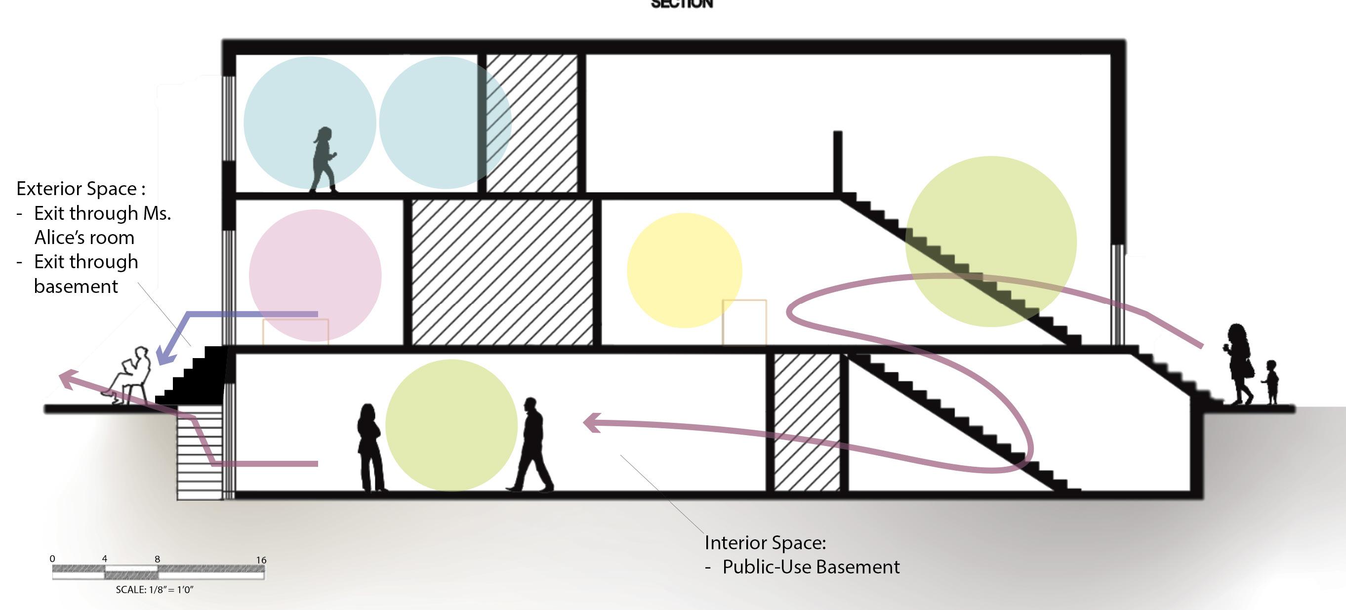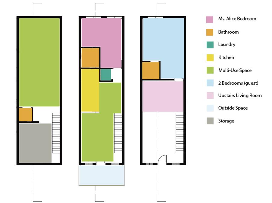 The main goal of this project was to ensure Ms. Alice had direct access to the spaces she used everyday, whilst still maintaining boundaries between the public and private spaces of her home. Iterative bubble diagramming and spatial agency explorations allowed for an understanding of how spaces were placed according to their function and connections.