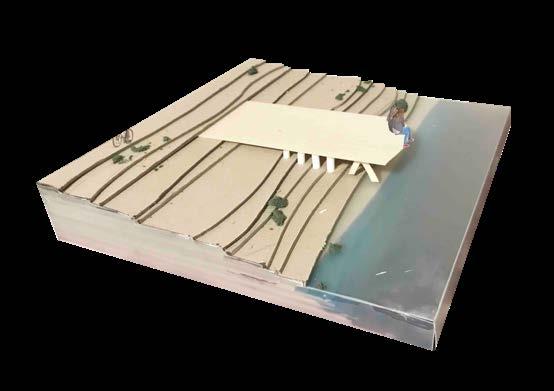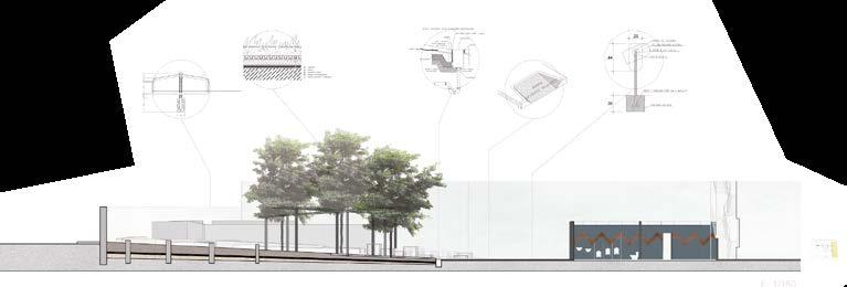 Losas: Las losas de hormigón van a llevar unas estructuras metálicas de 0,5cm de diámetro 1x1m de superficie, variando de tamaño; desde 0,40 hasta 0,70m consiguiendo una estructura flexible. En cuanto a su uso, teniendo la posibilidad de usarla como unas gradas hacia las pistas como zonas de reunión, zonas de estudio. Aprovechando las diferentes alturas se crean zonas de asiento y zonas más elevadas que servirán de mesas.